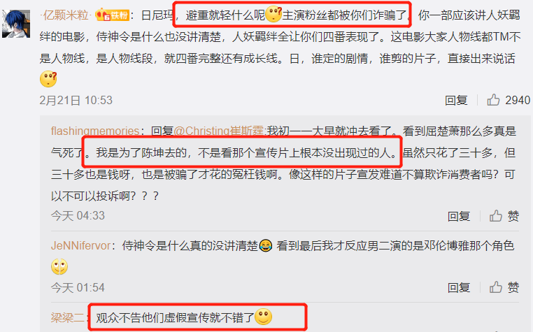 有趣的是,《侍神令》的一番是陈坤,二番是周迅,电影也多次用二人的合作进行炒作,相信不少观众也是冲着这个搭档去看的,然而有很多观众表示,在这部电影里,屈楚萧的戏份比陈坤还多,感觉自己受骗受骗了,以至于《侍神令》还发布了声明,说这种评价是“流言蜚语”。