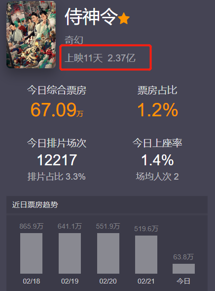 然而,在提早开始大力宣发的电影《侍神令》票房却低的有些惊人,《李焕英》《唐人街》《刺杀小说家》不用提,它的票房甚至低于成本不高的《熊出没》和《人潮汹涌》,上映11天票房仅为2.3亿,比起郭敬明同类型电影《晴雅集》的4.5亿低得多。