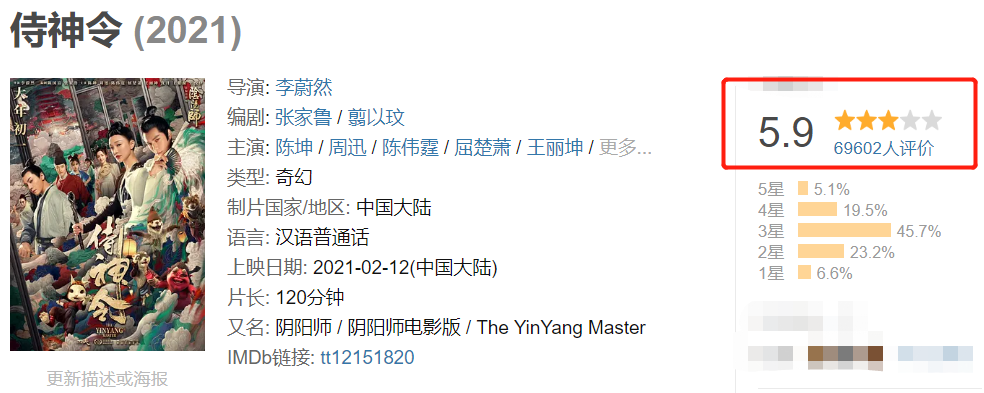 该电影的口碑也相当差,目前某网站的评分仅为5.9分。