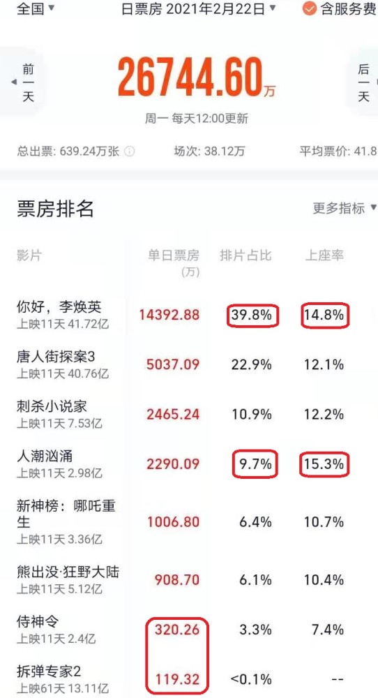 可是,《人潮汹涌》的上座率却超过了《你好,李焕英》《唐人街探案3》《刺杀小说家》,当然也超过了《新神榜:哪吒重生》《熊出没-狂野大陆》《侍神令》。《人潮汹涌》逆袭,还带动了刘德华主演的另一部电影《拆弹专家2》的票房飙升。