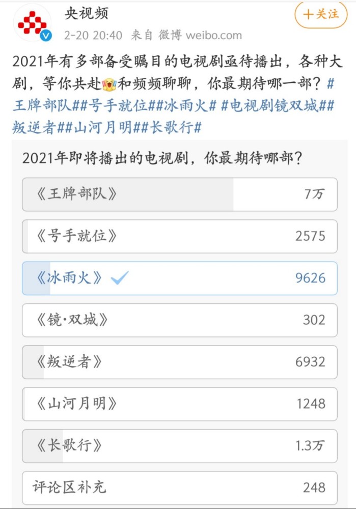 近期央视频发起了“2021年即将播出的电视剧,你最期待哪部?”的投票活动。肖战和黄景瑜领衔主演的《王牌部队》遥遥领先,深受粉丝的喜爱和关注。迪丽热巴和吴磊主演的《长歌行》凭实力收获观众的注意。