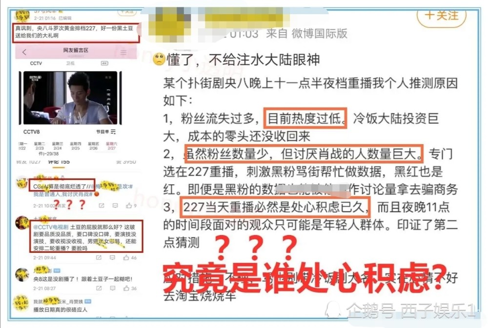 央视此举恐怕给了某些黑子当头棒喝。227当天重播意味深长。在临近2月27日的时候,黑子们扬言要送肖战一份大礼,纪念他们失去的家园。黑子们扬言要庆祝227周年的相关词条,早已经刷的热度起飞。