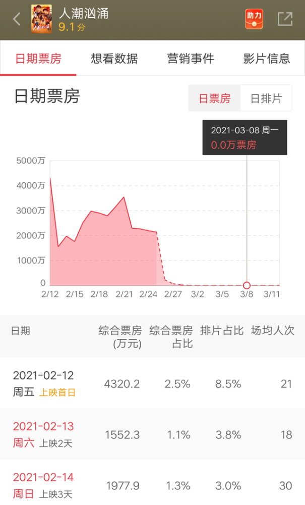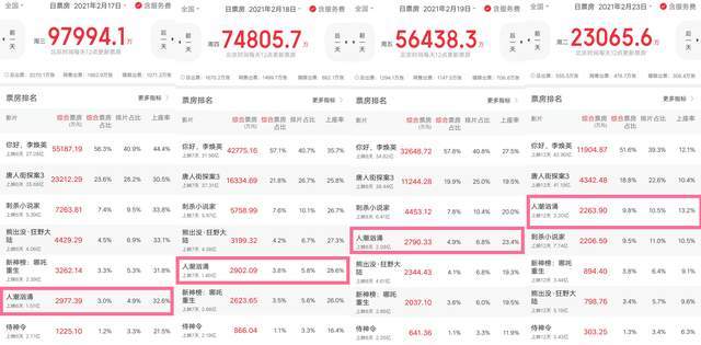 上映之初,《人潮汹涌》的上座率和票房在春节档7部影片中均位居倒数第一的位置。开局的晦气,让外界对这部影片并不看好,其最终票房的预测仅有1亿;直至上映第5天即将进入春节档尾声,《人潮汹涌》在单日票房与上座率方面才有所改观,逆袭《侍神令》来到单日票房第六的位置。