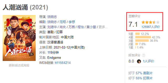 《人潮汹涌》影片能够取得目前的成绩离不开口碑的优势。《人潮汹涌》的豆瓣评分达到7.1分,在春节档上映影片中位居第三;同时猫眼的评分也达到9.1分,仅低于《你好,李焕英》。好的品质自然让这部作品更经得起时间的检测,以及市场的认可。