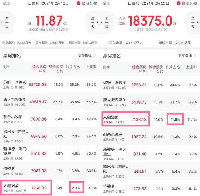 此后几日,《人潮汹涌》的逆袭之路不竭显现,在单日票房上更是连续超过《新神榜:哪吒重生》《熊出没:狂野大陆》以及《刺杀小说家》等影片,在单日票房的排名上更是从第6到第5,再到第4,以及目前第3的位置,成为春节档以后最有潜力的影片。