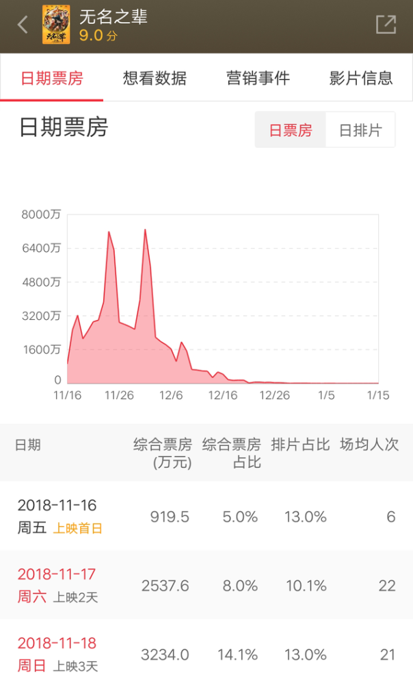 《人潮汹涌》的口碑优势已经明显有所显现,从2月13日到2月21日,《人潮汹涌》的单日票房趋势不竭上扬,更是直接从单日票房不到2000万元到单日超过3000万元,这样的逆跌趋势,也与同档期影片在单日票房上不竭降落形成了巨大的反差。