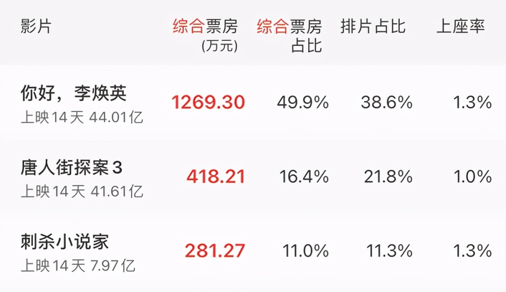 至少从目前来看,《你好,李焕英》依旧是每日的票房冠军,并且在排片占比和上座率上都比同期的其他电影更具优势。