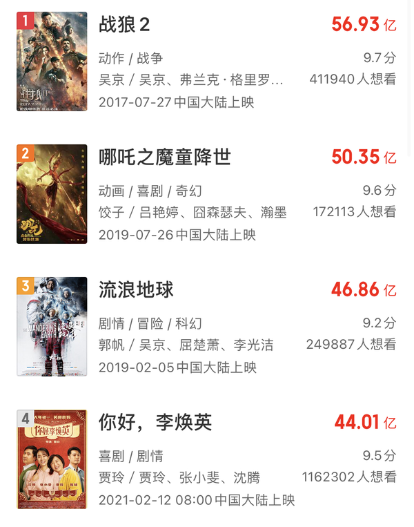 根据猫眼平台的数据显示,《你好,李焕英》有望突破50亿的票房,甚至很有可能将56亿的《战狼2》从中国影史票房第一的位置挤下来。