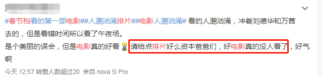 因为没有线上猫眼等平台、也没有线下万达等院线的投资,《人潮汹涌》成了春节档的“孤儿”,不足2%的排片,让其票房比蜗牛爬的还慢。华仔、万茜、肖央的影迷们想买票都买不到的揪心心情引起了很多网友的感同身受,纷纷呼吁多给些排片,可都被无视了。