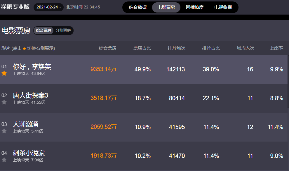 除了排片在不竭攀升,上座率也表现亮眼,几乎每到晚上,《人潮汹涌》的观影人数就开始快速增加,比如昨天晚上22:30分左右,人潮汹涌的上座率超过势头正猛的《李焕英》,达到了11.4%,是7部影片中最高的。而这也是院线在上映14天后,将其排片升到第3位的原因。