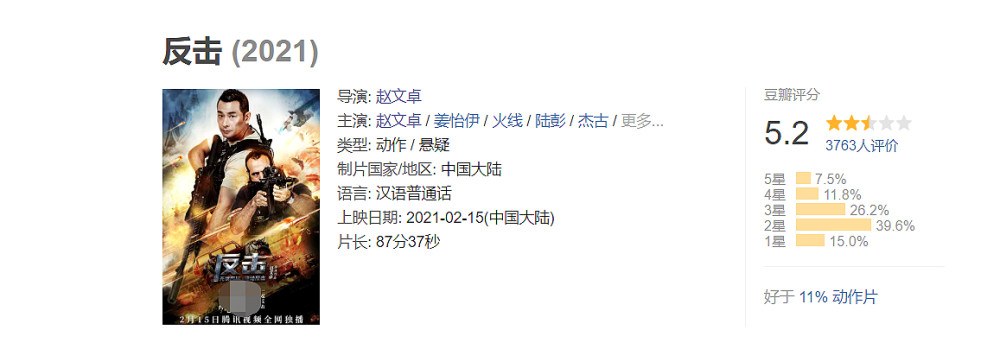 可惜天不遂人愿,《反击》刚上映口碑就彻底崩了,豆瓣评分只有5.2,是一部彻头彻尾的烂片。