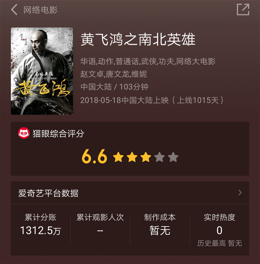 为何这么说呢?因为自从赵文卓跟甄子丹闹翻以后,演艺生涯相持不下,几乎到了无片可拍的地步。这几年更沦落到拍网大电影捞金,炒冷饭的《黄飞鸿之南北英雄》《黄飞鸿之怒海雄风》口碑票房双扑,分账票房加起来才2000多万。