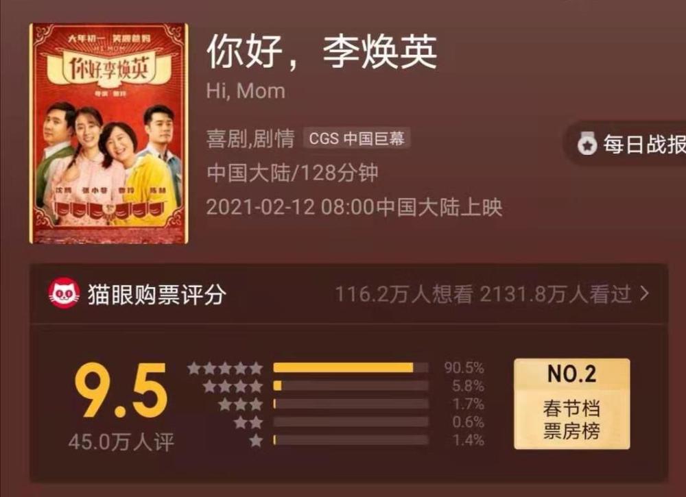 其实,在今年春节档的七部电影中,除了《李焕英》以外,还有一部电影的猫眼评分也超过了9分。