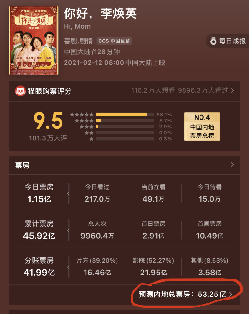 而根据官方给出的总票房预测,《你好,李焕英》的最终票房将会达到53亿,若这一数据届时成为现实,那么就意味着这部电影的票房将会排在中国影史的第二名,仅次于吴京的《战狼2》。