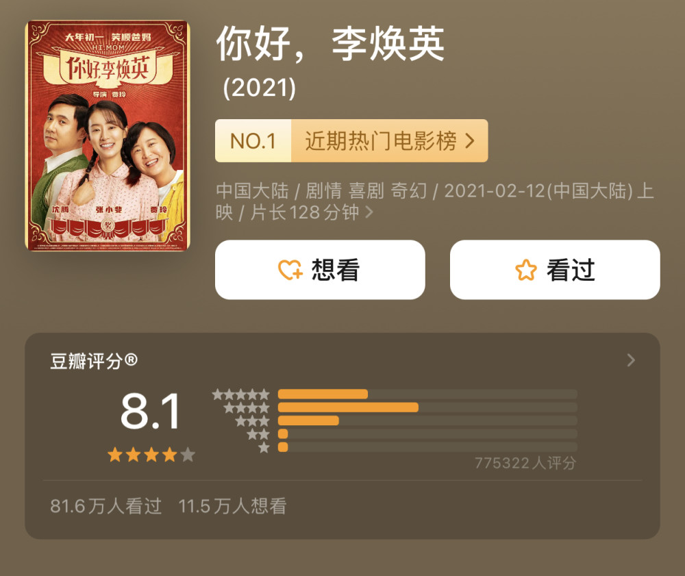 而除了票房成为春节档第一位以外,《你好,李焕英》的口碑评分也是此次春节档电影的第一位,目前在豆瓣的评分保持在了8.1。
