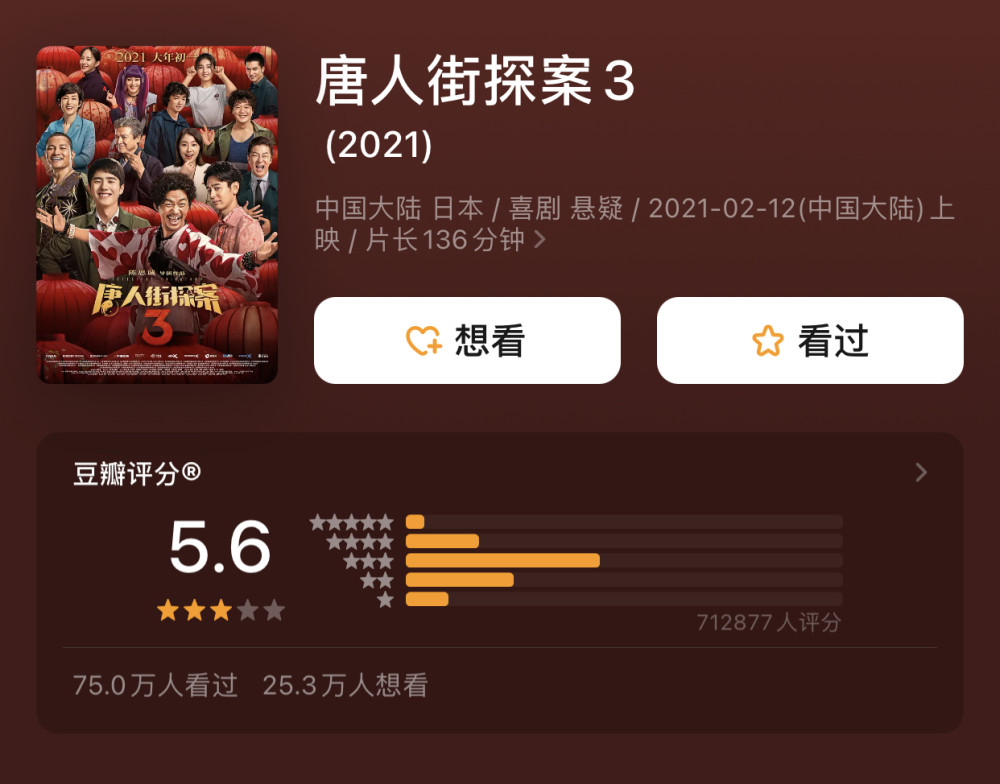 相比于《唐人街探案3》的5.6,《人潮汹涌》的7.1,《刺杀小说家》的7.0,《你好,李焕英》在口碑上可谓是碾压式的胜利。