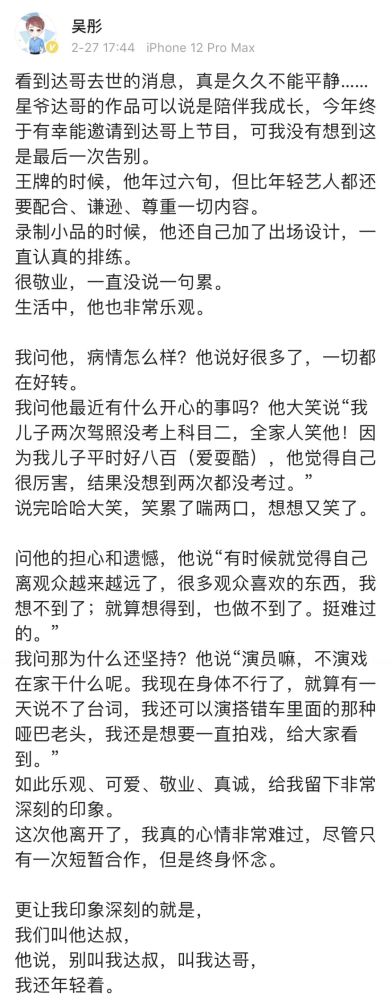 合作多年的周星驰说,“虽然这段时间一向在关注吴孟达的病情,多少会有一些心理准备,但还是非常难过悲痛,不舍得。现时我还无法接受。”