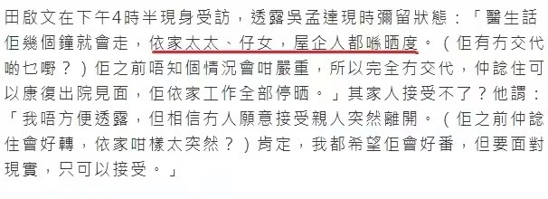从那今后吴孟达便再也没有更新,想必在医院里繁杂的治疗拖垮了他,也没有力气再和朋友打字聊天说话,每天都在顽强对抗病魔。