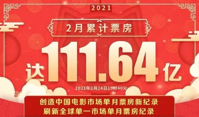 1.截止至2月24日,中国内地票房已经突破111亿元,创下中国电影单月票房纪录,同时刷新全球单一市场单月票房纪录。