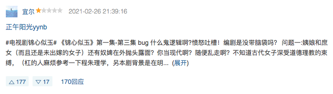 《锦心似玉》的编剧从多个层面被观众吐槽,也和她过往作品有关。程婷钰也是《锦绣未央》和《一千零一夜》的编剧,近期作品没有一部达到及格线。