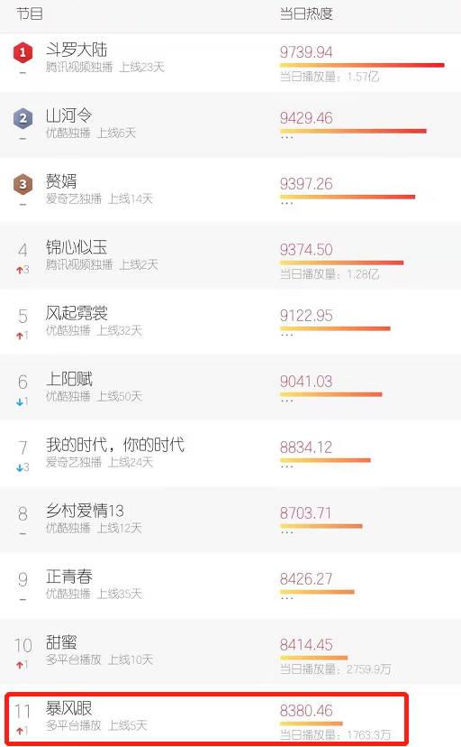 杨幂 的《暴风眼》开播之后,因为上映的时间以及上映后的收视率,一向受到部分观众的“同情”。上映时间,偏偏挑中了两大选秀节目之际,《山河令》也成为近日爆款,在这个点上映纵使是杨幂主演,也奈何不了被观众们忽略;上映后的收视率更是在惨绝人寰,上映4天的该剧至今还未超过《琉璃》以及最近的《赘婿》和《山河令》。