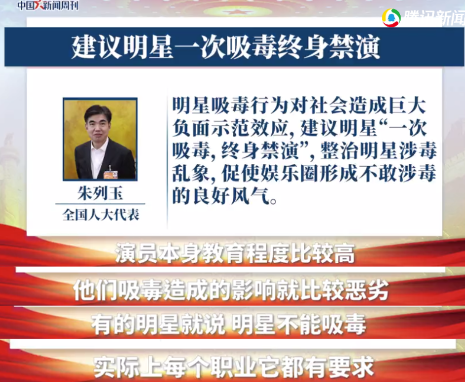 3月1日,人大代表朱列玉表示目前的娱乐圈频出吸毒丑闻这样的现象,对社会造成了巨大的危害和负面作用。朱列玉认为:身为一位公众人物,应当对社会起到正面作用,但是明星艺人出现这样的乱象显然是行业没有规范的结果,舆论对“明星禁毒”的限制非常有限,所以应当将“一次吸毒,终身禁毒”的规定写进法律,以便规范明星的行为,整顿这样的乱象。但是依然还有很多明星在违法后依然低调复出,仍然有大量的工作机会,显然对社会起到了反面的作用。