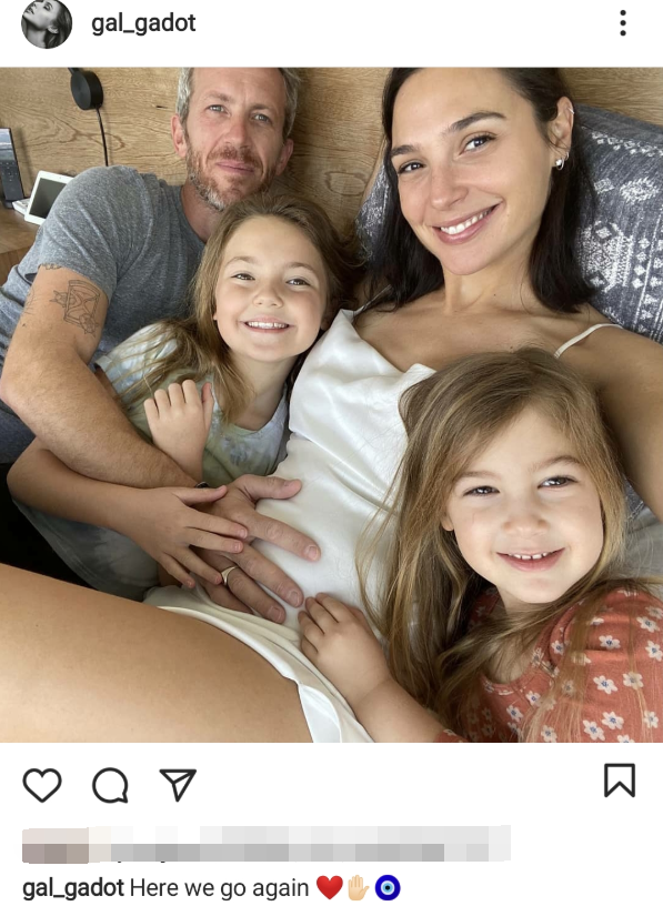 3月2日凌晨,36岁知名女星盖尔加朵在社交平台宣布怀上三胎喜讯,并晒出全家福,配文称:“Here we go again”,据悉盖尔加朵与富豪老公Jaron Varsano结婚12年,已经育有两个女儿。照片中,盖尔加朵笑容灿烂,素颜出镜,其老公Jaron Varsano则用戴着婚戒的手抚摸盖尔加朵的孕肚,两个女儿也甜笑着抚摸妈妈的孕肚,一家人全是高颜值!据悉Yaron Versano是以色列有名的地产大亨,两人的爱情和婚姻也十分浪漫稳定,两人走过了12年的婚姻,依然十分恩爱,而盖尔加朵才36岁,就再次怀上三胎,有颜有钱又有美满的家庭婚姻,真的是人生赢家!