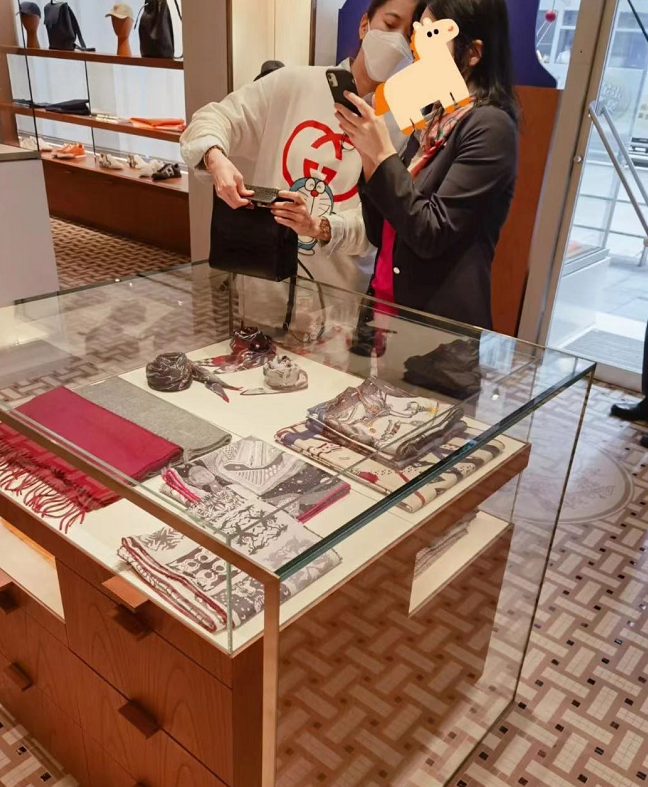 照片中,身穿机器猫图案卫衣口罩遮面,手里摆弄着一款黑色爱马仕包包歪头正在和工作职员交换,那一脸认真的小表情看来是要拿下的节奏。
