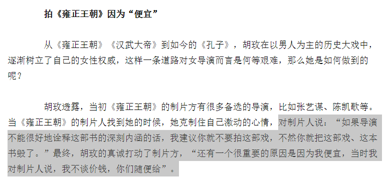 原本,她压根不在《雍正王朝》的候选导演名单之内,制片人刘文武看上的是胡玫的同学陈凯歌,还有隔壁摄影系的张艺谋。