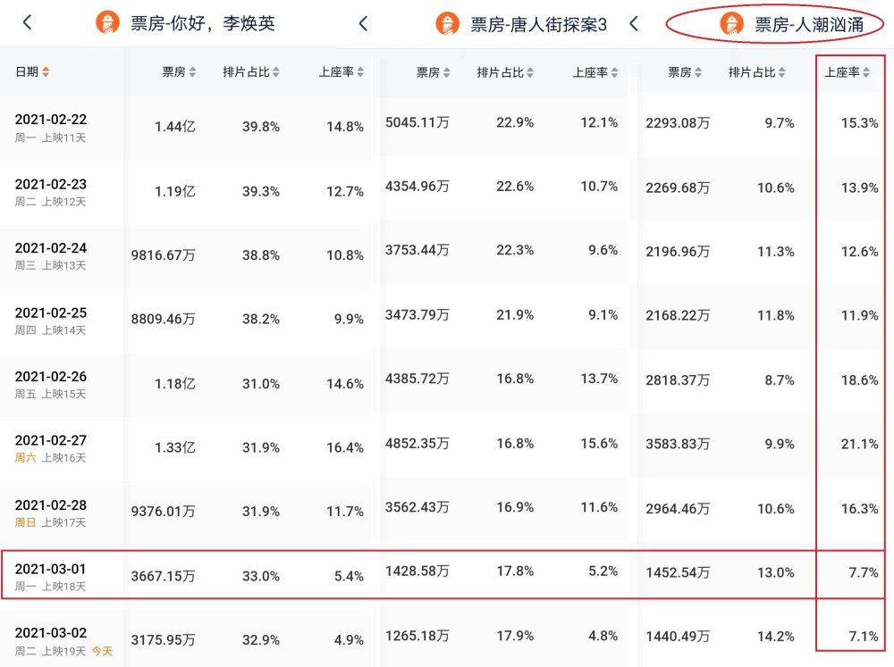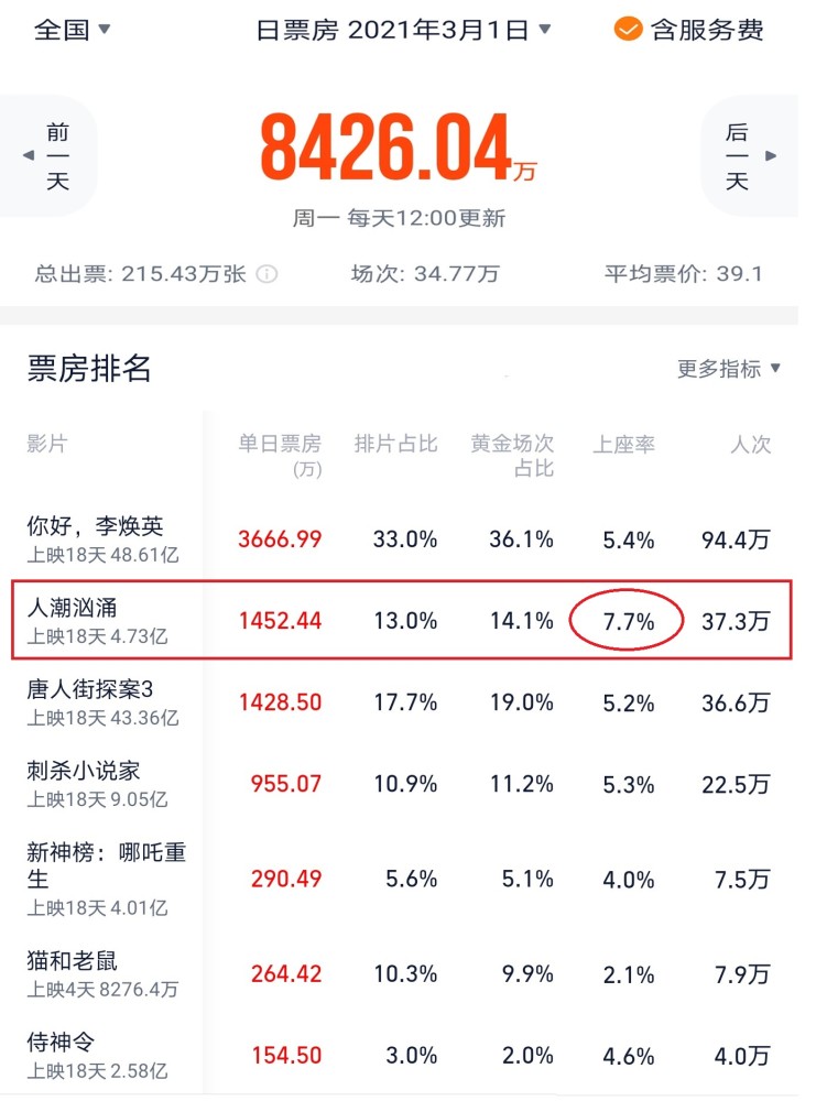 自从2月21日开始,《人潮汹涌》都是日票房上座率冠军,但排片量一向都不高。现在基本维持在10%的排片量,这让《人潮汹涌》单日票房始终不行提高。“排片率”可是决定一部电影票房的杀手锏,都没有排片,还谈甚么票房。