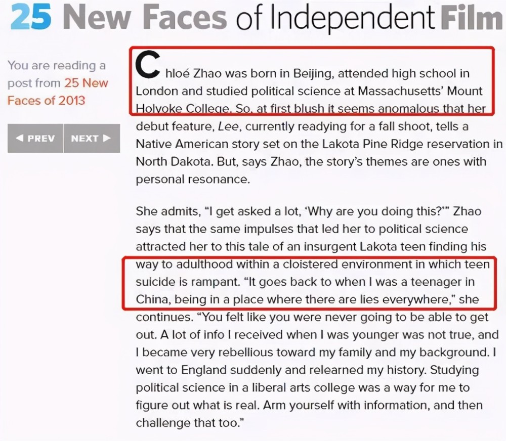 据领会赵婷14岁就出国留学,一向在研究英国历史和美国文化,此次的《无依之地》讲述的也是美国文化。赵婷对中国反而没有太多感情,这么多年一向在外国生活,男友和朋友,以及接受的知识全都是外国的。