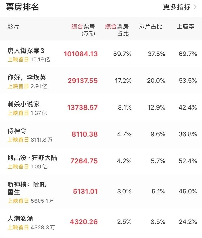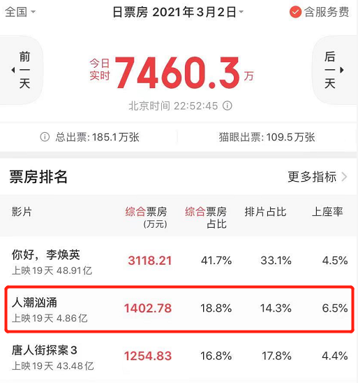 在大年初一上映这一天,《人潮汹涌》毫不料外地成为了七部电影中票房最低的一部,因而从第二天开始影院就开始降低它的排片率,等到大年初四这一天,《人潮汹涌》的排片占比已经低于3%。