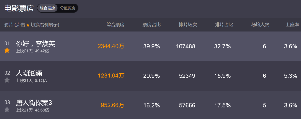 近日,电影票房的排行榜发生了变化,《人潮汹涌》的单日票房排在了第二,将《唐探3》挤到了第三名位置,不但如此,两部电影在排片场次相近的情况下,影片的上座率前者比后者要高,这也证明《人潮汹涌》的热度上升了。
