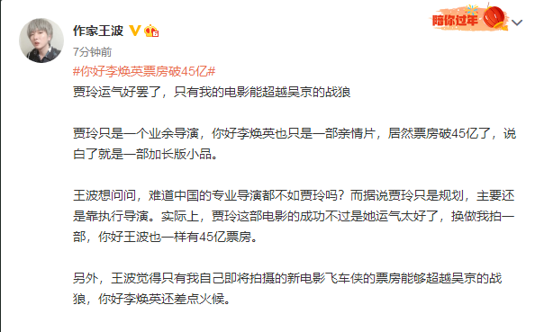著名作家王波,就调侃贾玲的电影火爆,只是贾玲的运气好,不是贾玲的实力强,王波认为,贾玲的电影无法和吴京的战狼媲美,只有王波导演的电影才能和吴京的战狼媲美。