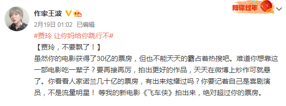 随即,王波突然站了出来,对刘信达进行了回击:“贾玲,不要飘了!虽然你的电影获得了30亿票房,难道你想靠这一部电影吃一辈子?”接着,王波又补充道:“虽然你的电影取得了很好的成绩,已经快50亿了,但是还需要虚心求教,在电影拍摄方面,你还是个新人,必然要尊重张艺谋、陈凯歌这样的前辈。刘信达虽然在导演方面没什么功力,但客观来说也算是贾玲的前辈,但是他这样说话就有些不靠谱了,贾玲50亿票房怎么就没有用了?难道人必然要结婚才能证明自己幸福吗?王波奉劝刘信达,不要多管闲事!”