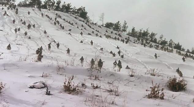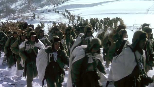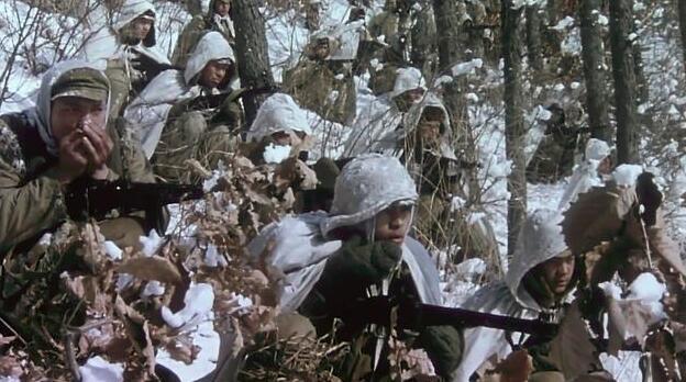军人的行军镜头、埋伏在雪林当中,也都非常具有震撼力,彰显了那个时代“能吃苦”、“能打胜仗”的精神。