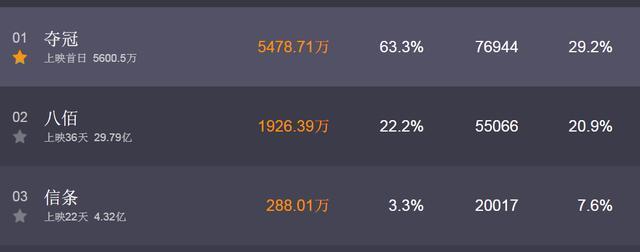 再加上有黄渤的出演,就更加拉好感。不到十个小时,《夺冠》就有了近3000万的票房,排片占比29%。首日截止23点,就有将近5000万的票房。看来,在国庆前上映的电影也是有优势的,竞争压力没有那么大。