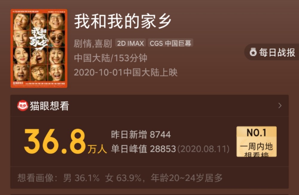 截止发稿前,电影《我和我的家乡》以3360.1万的好成绩位列国庆档新片预售票房榜第二,在猫眼app上共有36.8万人将该片标记为想看。