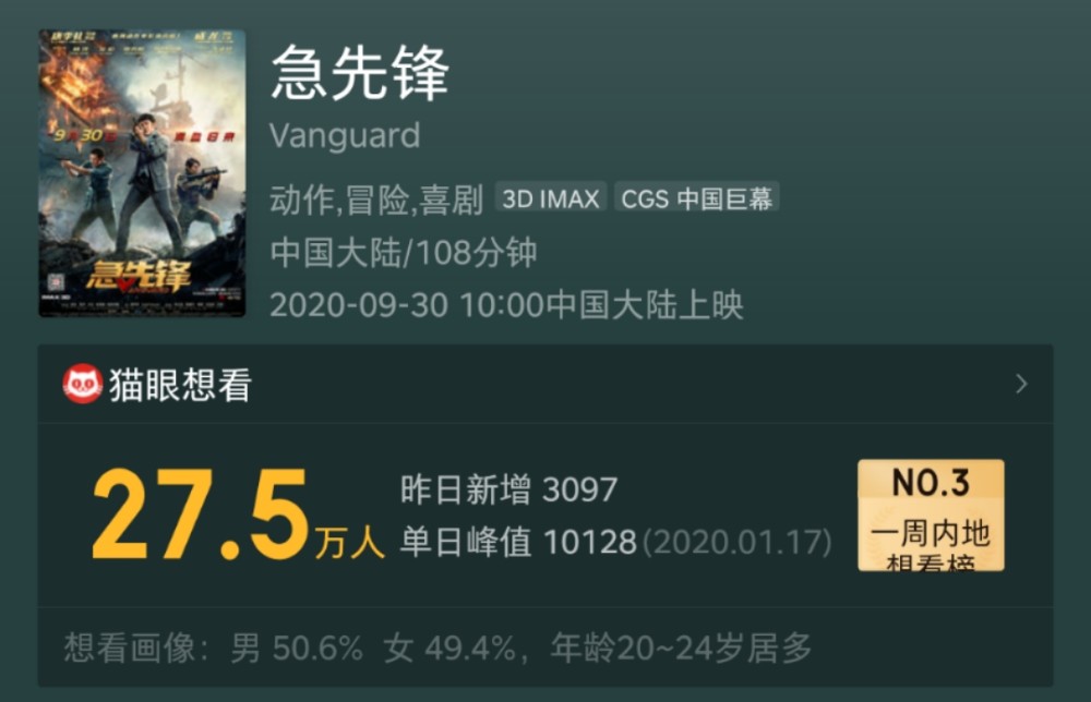 电影《急先锋》则以2946.4万元的票房紧跟第三,猫眼想看人数为27.5万人。