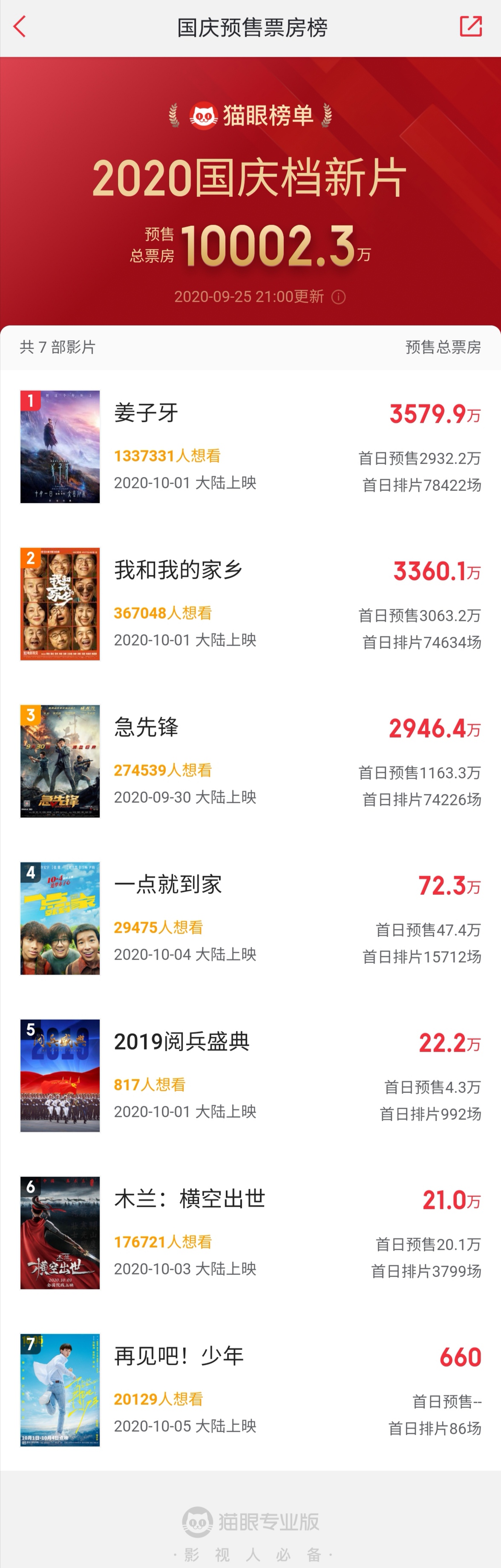 根据猫眼专业版数据显示,截至9月25日21:00,国庆档新片的总预售票房超一亿钱。国庆档新片中,《姜子牙》、《我和我的家乡》、《急先锋》这三部影片的表现十分亮眼,总预售票房加起来超过9800万元,占了国庆档新片预售总票房的一大部分。