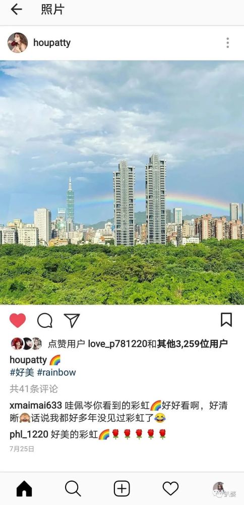 从侯佩岑过往ins看,她一向都蛮喜欢拍彩虹的,晒过不少她亲手拍的彩虹照。