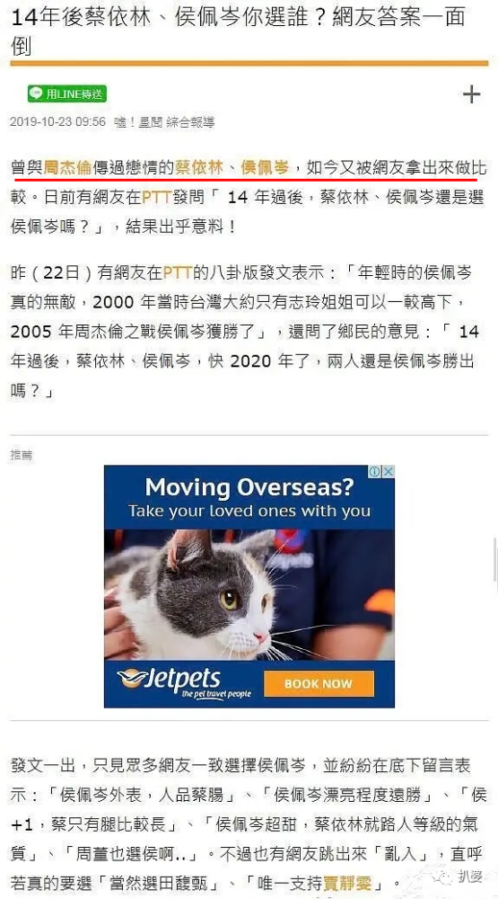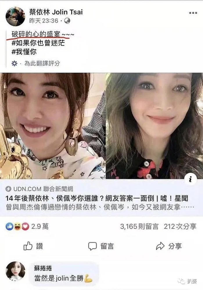 去年10月蔡依林深夜分享了这么一篇标题为《14年后蔡依林、侯佩岑你选谁》的文章