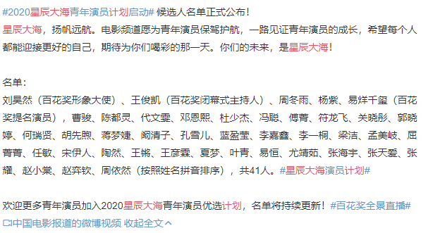 根据官方公布,2020年共有41位演员入选2017的星辰大海计划,他们也将在本届大众电影百花奖的闭幕式上首次和观众见面。入选的41位年轻演员,不乏刘昊然、王俊凯、周冬雨、杨紫、易烊千玺等众多口碑很好的年轻演员。