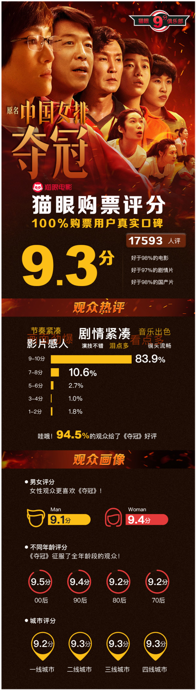 影片由陈可辛执导,巩俐、黄渤、吴刚、彭昱畅、白浪、中国女子排球队等主演,自昨日上映以来好评如潮,猫眼平台影片口碑也新鲜出炉,9.3的开画评分高于98%的国产电影。