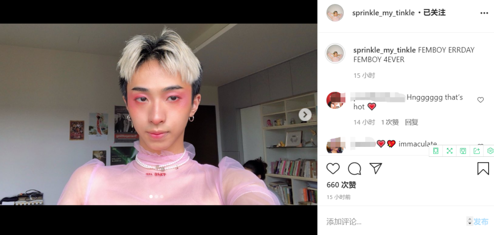 从照片的背景来看,似乎是在自家房间拍摄的。剪了一头超短发,头发染成浅金色的哈利,穿了一身粉色纱裙,脸上还化了浓妆,一大片红色的眼影格外的抢镜。