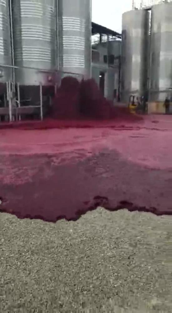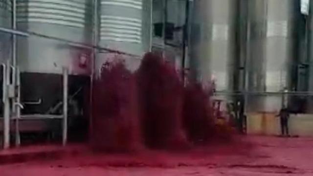 红酒工厂的工作人员只能眼睁睁看着,也无力吐槽,十分无奈。5万升红酒是什么概念?酒厂边上的田野被红酒冲刷后形成了一片血海,场面颇有点恐怖片的意思。