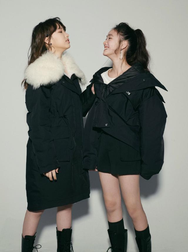 姐妹俩都有同款瓜子脸,鼻梁高挺。Elly穿着羽绒服秀出纤细大长腿,不知道是否是近大远小的关系,妹妹的腿显得粗很多。