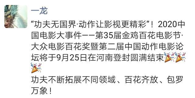 一龙欣慰地说道:““功夫无国界·动作让影视更精彩”!2020中国电影大事件——第35届金鸡百花电影节·大众电影百花奖暨第二届中国动作电影论坛在河南登封圆满结束。功夫不断拓展差别领域、百花齐放、一应俱全!功夫搏击与时俱进、多面学习发展、老幼皆宜、健康阳光才是它最美的未来,幸会祝各位好运吉祥!”