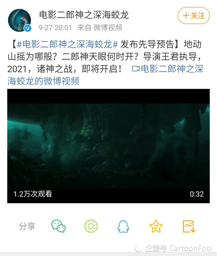 9月27日,电影《二郎神之深海蛟龙》的官方微博发布了一则消息: