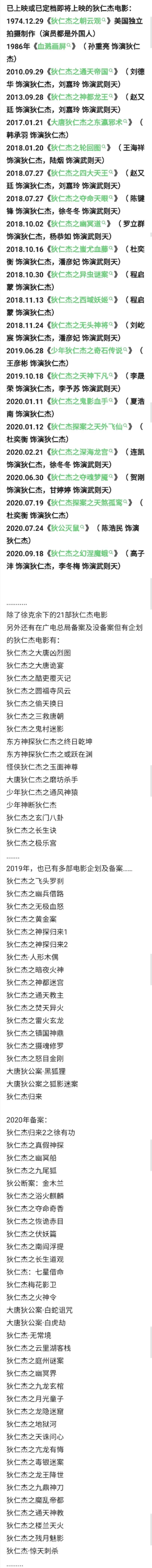 如此同时,从2017年开始,良莠不齐的制片方,一股脑入驻了“狄仁杰”IP,除了已经上映和播出的22部电影以外,还有很多都已通过立项和企划,种类之多,让人瞠目结舌。